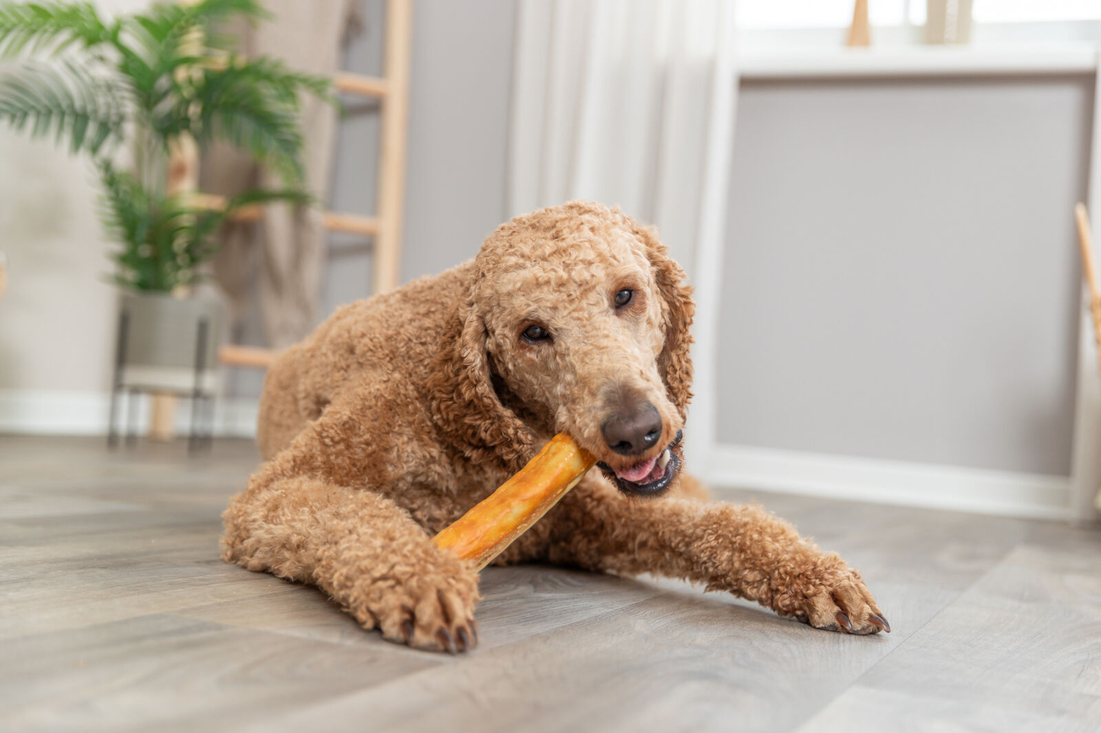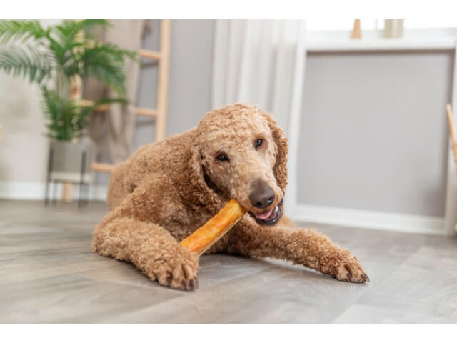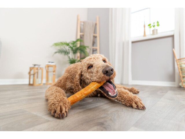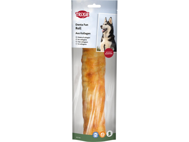 Fabricat din colagen usor digerabil Invelite in carne de pui Compozitie colagen (55 %), carne de pui (21 %), faina de orez, glicerina, pudra de ardei ardei, pudra de galbenus de ou, celuloza | formula fara gluten | fara zahar adaugat | A se pastra intr-un loc racoros si uscat.