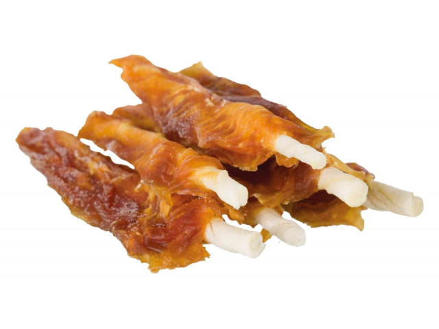 Rulouri de mestecat din piele cruda cu piept de pui Continut de carne 65% Compozitie: piept de pui (65 %), piele bruta, amidon de porumb, glicerina | formula fara gluten | fara zahar adaugat | A se pastra intr-un loc racoros si uscat. Dimensiuni: 14 cm, Continut/Greutate: 20–30 g / bucata ATENTIE!!! Acest produs este ambalat la set de 10 bucati. Pretul afisat este la bucata dar se vinde doar la set.