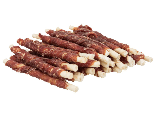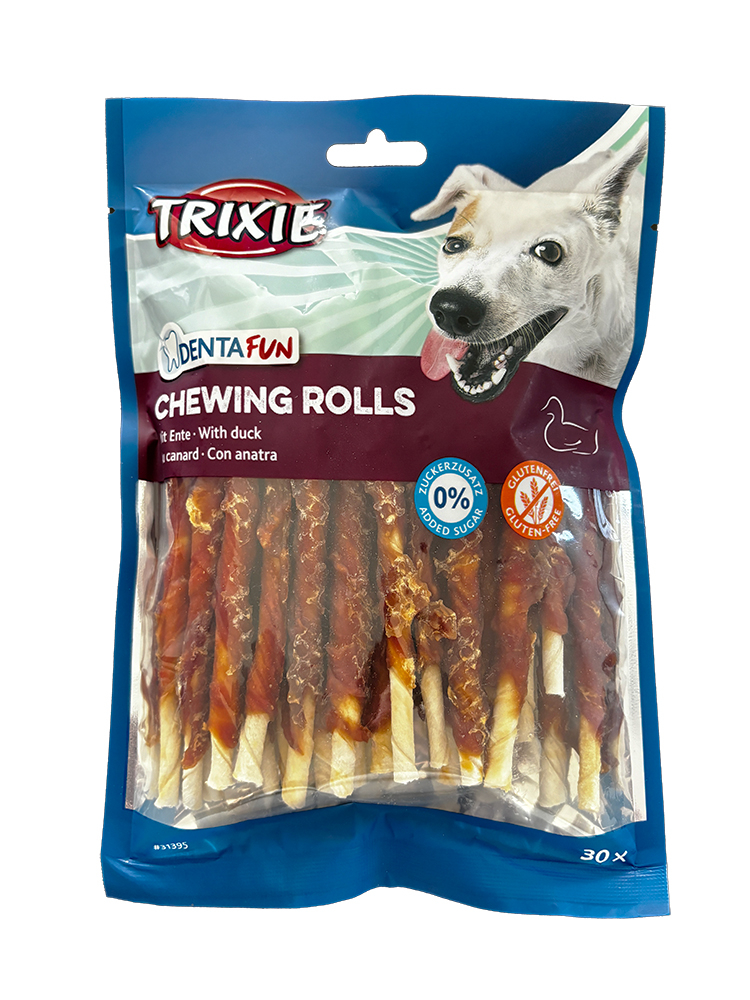 Bastoane din piele uscata invelite cu carne de rata. Potrivite pentru o mestecare indelungata. Fara adaos de zahar Nu contine gluten Multi caini se bucura sa mestece neincetat, din acest motiv TRIXIE a dedicat o linie de mestecat. Linia Denta Fun ofera articole distractive cu efecte imbunatatite asupra sanatatii dintilor. Aceste gustari sunt realizate din piele de vaca, faciliteaza indepartarea tatrului de pe dinti siprevine formarea acestora. Dimensiuni: 12 cm Continut / Greutate: 30 buc. / 240 g