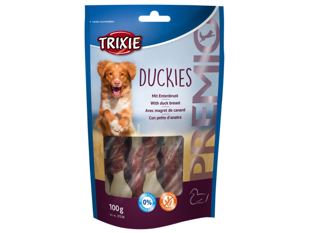 Gustari de ros sub forma de oase invelite cu piept de rata. Cu un continut de 70% carne. Ambalaj inchis ermetic. Fara gluten si zahar
