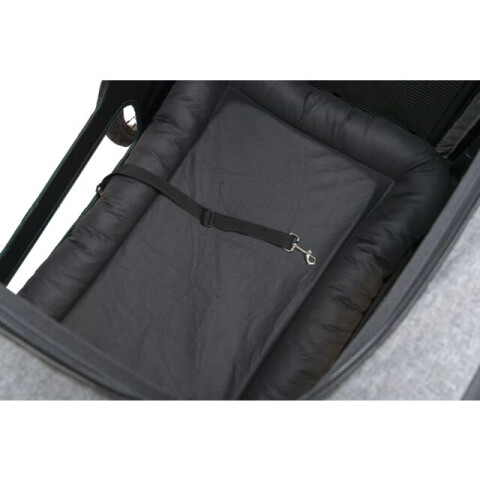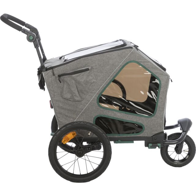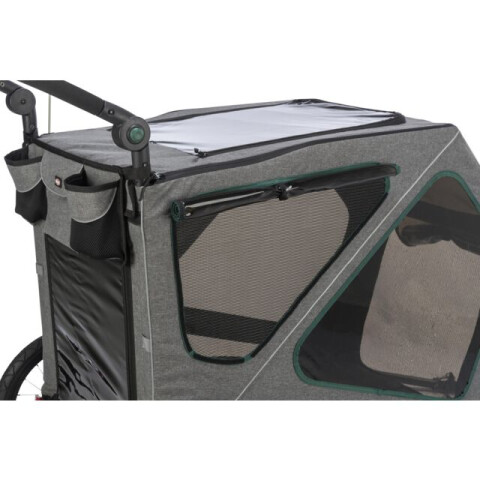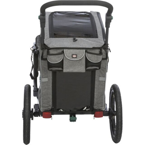 Interior confortabil Usa spate mare pentru intrare si iesire: poate fi folosita ca rampa Asamblare si demontare usoara Roti cu sistem de atasare rapida Insertiile din plasa pot fi acoperite cu protectie impotriva ploaielor Cu diverse buzunare si suporturi pentru bauturi Cu frana de parcare Perna cu spuma vascoelastica Cu lesa scurta integrata Cu maner reglabil pe inaltime Bucle pentru atasarea unei lumini din spate Cu reflectoare Fanion de semnalizare cu motiv reflectorizant Inclusiv carlig de remorca