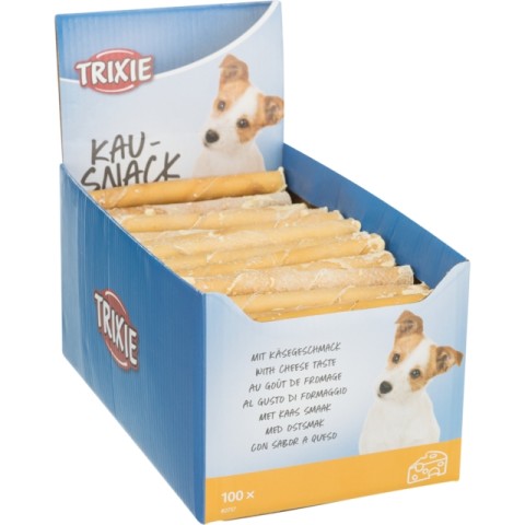 Din piele uscata, umplut cu cascaval. Compozitie: lapte si produse lactate, piele bruta, uleiuri si grasimi, zaharoza | formula fara gluten | A se pastra intr-un loc racoros si uscat.