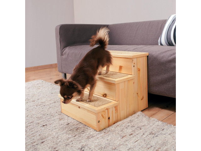 Material: lemn de pin Covorasul impiedica alunecarea patrupedului. Ajuta animalul sa ajunga in locuri mai inalte independent fara a fi nevoit sa sara. Protejeaza articulatiile animalului de companie. Recomandabil in cazurile de artrita. Cu spatiu de depozitare. Dimensiuni: latime-40 cm, inaltime-38 cm, lungime- 45 cm
