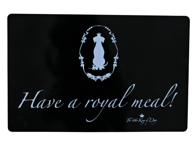Suportul pentru castron pastreaza zona de hranire a cainelui curata. Material: plastic Baza non-alunecare. Usor de curatat Dimensiuni: 44 × 28 cm Inscriptie: Sa ai o masa regala! Culoare: negru Motiv: Regele cainilor