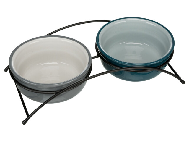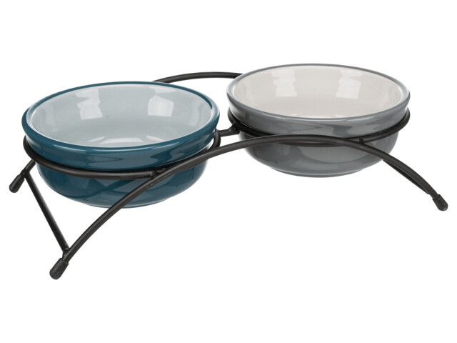Informatii despre produs: -2 castroane ceramice cu suport -Suport metalic vopsit cu pulbere, negru -baza anti-alunecare datorita picioarelor din cauciuc