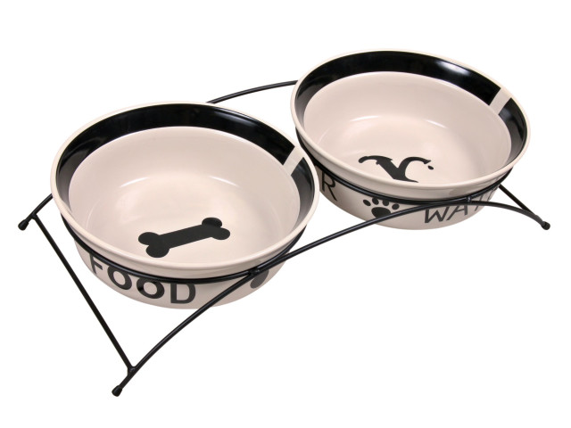Trixie Set 2 Castroane Ceramice Cu Suport Metalic, 2×2.6 l/ø 25 cm/54x12x24 cm, Alb/Negru, 24643