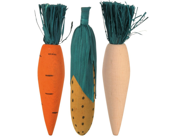 Set 3 jucarii din lemn si paie pentru iepuri si porcusori de Guineea. Confectionate din materiale naturale 100% Potrivite pentru ros. Masuratori: 10 cm Pentru: iepuri, rozatoare mici Continut: 3 buc.