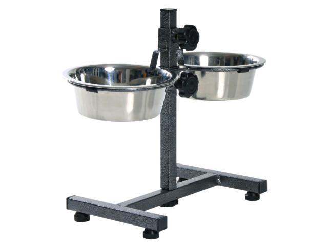 Set 2 castroane cu suport Trixie, inox, 2 x 0.75 l/15cm Set cu 2 boluri din otel inoxidabil si suport in forma de H din metal. Beneficii: Confera o inaltime confortabila pentru hranire; Inaltime reglabila pana la: 27 cm; Postura corecta sprijina o buna digestie a animalului; Are picioruse din cauciuc anti-alunecare; Igienice, usor de curatat; Bolurile pot fi spalate la masina automata de vase. Masuratori: 0,75 l / ø 15 cm Capacitate: 0,75 l