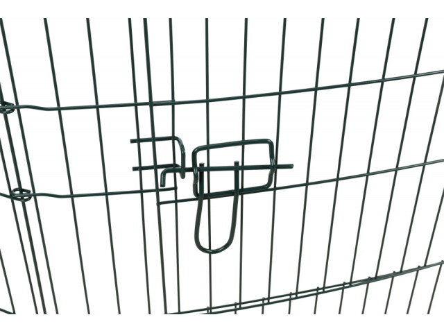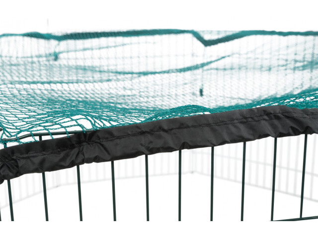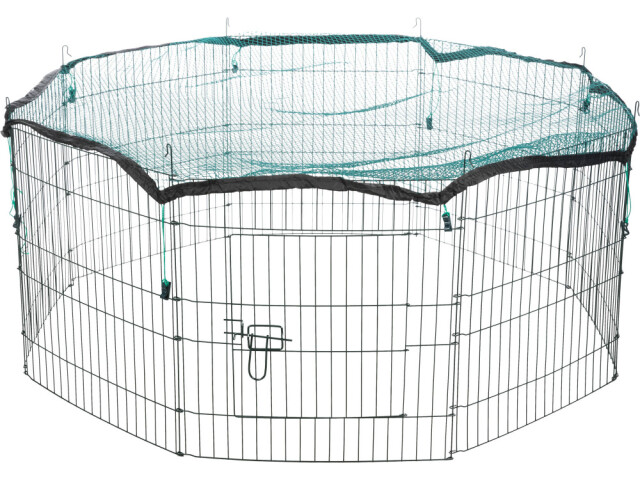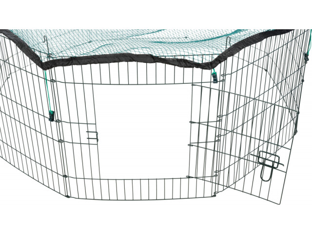 Tarc cu plasa de protectie potrivit pentru exterior. Material: metal Cu 8 elemente de 60 × 57 cm si cu usa. Plasa de protectie impiedica animalele de companie sa sara. Protectia impotriva pasarilor de prada si a pisicilor. Cu banda elastica pentru atasare usoara. Ochiuri: 1 × 1 cm. Masuratori: ø 150 × 57 cm Culoare: verde