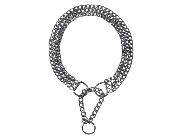 Zgarda semistrangulanta confectionata din crom. Zgarda semistrangulanta ajuta la reducerea tragerii cainelui in timpul mersului. Daca cainele trage mai tare de lesa, zgarda se va strange pana la punctul de oprire stabilit. Cand cainele se opreste din trasul lesei, zgarda se largeste din nou si devine confortabila pentru caini. Punctul de oprire sau nodul zgarzii este reglabil: inainte de utilizare, punctul trebuie setat astfel incat animalul de companie sa nu poata aluneca din zgarda si sa nu fie niciodata prea strans cand este tras.