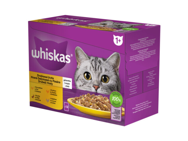 Ca iubitori de pisici, stim ca torsul este cel mai bun sunet pe care il poti auzi. De aceea felinele noastre bucatari muncesc din greu pentru a pregati mese delicioase care fac milioane de pisici din toata lumea sa se grabeasca la bolurile lor torcand entuziasmate cu o satisfactie buna de lins. Pregatite cu dragoste si grija, fiecare gustare are un balans nutritional care asigura pisicii tale tot ce are nevoie ca sa poata continua sa toarca. Pregatite special pentru a pastra bunatatea naturala si gustul delicios al ingredientelor de inalta calitate, mesele noastre preferate vor face pisica ta sa se grabeasca spre bol mai rapid ca niciodata. De la pisoi jucausi la frumoasele feline mature, retetele noastre delicioase sunt create pentru un tors fericit la orice varsta… la ora mesei si nu numai. Compozitie: carne si derivate de origine animala (35%, inclusiv 4% pui in fiecare bucatica*), cereale, minerale, derivate de origine vegetala, diverse zaharuri. *Bucatica in mod tipic 40% din produs. Compozitie: carne si derivate de origine animala (35%, inclusiv 4% rata in fiecare bucatica*), cereale, minerale, derivate de origine vegetala, diverse zaharuri. *Bucatica in mod tipic 40% din produs. Compozitie: carne si derivate de origine animala (35%, inclusiv 4% pasare in fiecare bucatica*), cereale, minerale, derivate de origine vegetala, diverse zaharuri. *Bucatica in mod tipic 40% din produs. Compozitie: carne si derivate de origine animala (35%, inclusiv 4% curcan in fiecare bucatica*), cereale, minerale, derivate de origine vegetala, diverse zaharuri. *Bucatica in mod tipic 40% din produs. Aditivi per kg: Aditivi nutritionali:Vitamina C:702mg, Vitamina D₃:200UI, Taurina:620mg, Cupru (Sulfat de cupru (II) pentahidrat):1.2mg, Iod (Iodat de calciu, anhidru):0.22mg, Fier (Sulfat de fier (II), monohidrat):11.2mg, Mangan (Sulfat de mangan, monohidrat):2.2mg, Zinc (Sulfat de zinc, monohidrat):16.2mg/Aditivi tehnologici:Guma cassia:2148mg/Aditivi senzoriali:Arome. Valori analitici (%): proteina:7.8;continut de grasimi:4.0;materie anorganica:1.6;fibra bruta:0.25;umiditate:84.5. Instructiuni de hranire: O pisica de 3 kg necesita 3 – 3 1/2 pliculete zilnic, o pisica de 4 kg necesita 3 1/2 – 4 pliculete zilnic, o pisica de 5 kg necesita 4 – 4 1/2 pliculete zilnic. 1 plic poate fi inlocuit cu 16 g de hrana uscata WHISKAS(R). Tineti cont de caloriile care provin din gustari.